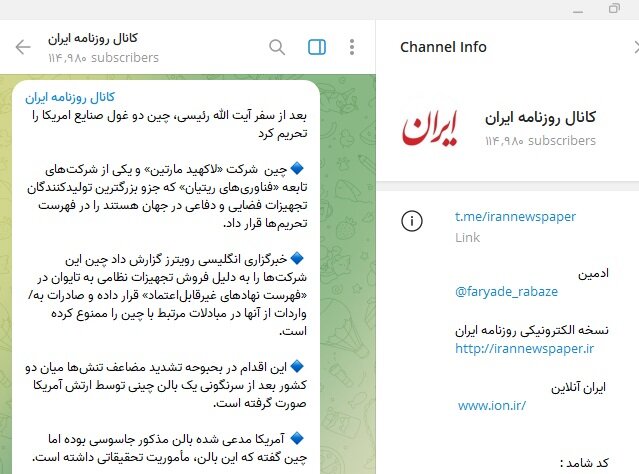 کانال تلگرامی روزنامه «ایران»، تیتر «بعد از سفر آیت الله رئیسی، چین دو غول صنایع امریکا را تحریم کرد» را منتشر کرد.