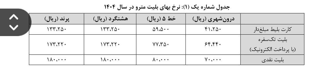 رئیس کمیسیون عمران و حمل و نقل شورای شهر تهران تصریح کرد: باید تاکید کرد که بلیط مترو که بصورت نقدی خریداری شود کمی گران تر خواهد بود بر این اساس بهای بلیت درون شهری کارت مبلغ دار برای سال آینده مبلغ ۷ هزار تومان، برای خط پنج مبلغ ۸ هزار تومان، برای خط هشتگرد ۱۸هزار تومان و برای پرند مبلغ ۱۸ هزار تومان خواهد بود.